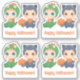 Adorable babies dressed in Halloween costumes. The one on the left is dressed as a green dragon with orange spikes. The one on the right is wearing a black cat costume with a big orange bow. A curved pumpkin sits between them and just a little behind. Customisable text.