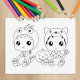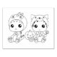 Adorable babies dressed in Halloween costumes. The one on the left is dressed as a dragon. The one on the right is wearing a cat costume with a big bow. A curved pumpkin sits between them and just a little behind. Made for easy colouring.