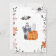 Adorable festive Halloween invitation featuring ghosts, pumpkins, bats, spiders and fall leaves.