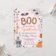 Adorable festive halloween invitation featuring ghosts, pumpkins, bats, spiders and fall leaves.
