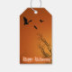 A Halloween silhouette illustration featuring spooky black bats and creepy trees with a drippy "Happy Halloween" Greeting on a mystic orange background.