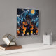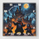 Three playful bears don festive hats, joyfully holding pumpkins near a spooky castle under a glowing moonlight.