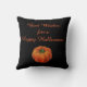 Adorable flying witch silhouette on orange background graces one side of this pillow and the message, "Best Witches for a Happy Halloween", in orange lettering on a black background graces the other side. A fun and useable Halloween decoration, this pillow is made in the USA.