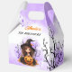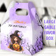 Halloween Birthday large gable favour boxes for little girls with a cute little witch and pumpkin in purple, black and orange. Easily personalise all the text. You can choose from 3 sizes of these gable favour boxes - Kate Eden Art