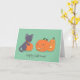 Cute black cat with red collar is standing over a small pumpkin and talking to a pair of animated pumpkins. One of the pair, a large round pumpkin, is smiling at the kitten, the other, tall slim pumpkin, appears to be spooked by a tiny spider.