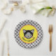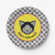 This paper plate is decorated with a pattern of black cat faces and a single cat graphic set against a full moon like yellow circle, a great design for your Halloween party.
