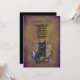 Any good witch has her familiar and often times it is a black cat. An exquisite rendering of a black cat in a witchy atmosphere on an rustic aged background is the perfect touch for this Halloween party invitation. All the information your guests will need can be personalised to fit your needs. The back of this invite is black with an image of three witches potion bottles.