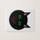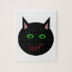 This awesome puzzle features a black cat with pointed ears, bright green eyes and a sly red grin. This creepy kitty is perfect for Halloween or for cat lovers.
