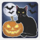The design is a stylised illustration featuring a black cat and a jack-o’-lantern under a full moon with bats in the background.Halloween Night Pats