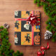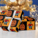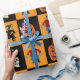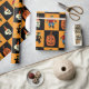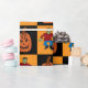 A black and orange checkerboard design with a witch on a broom, a jack-o-lantern,a skull with a candle, and a Frankenstein Monster.
