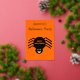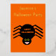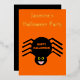 This beautiful foil Halloween Party invitation features a spooky black spider with eight hairy legs, yellow eyes with big black pupils and its mouth open showing its fangs. There is orange text that reads “Happy Halloween” and a matching orange background. The custom text on the front is in beautiful gold foil. There is additional text on the back so you can include all the details.