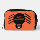 This awesome Halloween cosmetic bag features a spooky black spider with eight hairy legs, yellow eyes with big black pupils and its mouth open showing its fangs. There is orange text that reads “Happy Halloween” and a matching orange background.