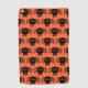 This awesome golf towel features a spooky black spider with eight hairy legs, yellow eyes with big black pupils and its mouth open showing its fangs. There is orange text that reads “Happy Halloween” and a matching orange background.
