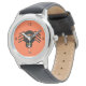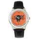 This beautiful Watch features a spooky black spider with eight hairy legs, yellow eyes with big black pupils and its mouth open showing its fangs. There is orange text that reads “Happy Halloween” and a matching orange background.