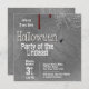 A scary Halloween illustration featuring a spider web with a hanging black spider, blood drips and "Halloween" lettering written with bones on a gravestone.