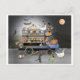 A Halloween bus, filled with animals and followed by bats and a witch is driven by a rabbit under a harvest moon.