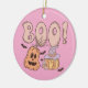 Boo! Halloween Boo design perfect for anyone celebrating the Halloween season, features pink text that reads BOO and has a pumpkin, witch hat, jack o lantern, spider web, and bats!