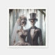 A skeletal bride and groom dressed in wedding attire complete with floral accessories and a top hat set against a misty forest backdrop