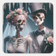 A skeletal bride and groom are depicted dressed in intricate wedding attire, with the bride adorned in flowers and a veil and the groom wearing a top hat and bow tie.