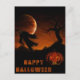 A dark yet friendly Halloween card with a jack-o-lantern in the foregrounds and a scarecrow swaying in the breeze in the back.