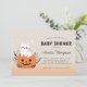 Invite your guests in style with this cute baby shower invitation, featuring a Halloween-inspired illustration of a cat sitting on a pumpkin. The light orange background adds a soft, festive feel, perfect for a themed baby shower. All text is fully customisable, allowing you to personalise the details for your special event.
