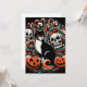 Embrace the spooky season with this captivating Halloween-themed illustration showcasing an elegant white cat poised among intricately carved pumpkins. Swirling autumnal patterns dance around eerie skulls, creating a mesmerising blend of fall festivity and gothic charm.