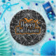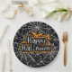 A Happy Halloween Paper Plate In Black With White Cobwebs And Orange Bats For Halloween Parties