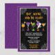This fun and spooky invitation features Halloween themed cocktails with decorations such as a witch's hat, broomstick and cauldron, ghost, bat, pumpkins and eyeballs. In the background is a black and purple damask pattern with spider webs. The text combines decorative and serif fonts for a stylish and modern look. This is perfect for a Halloween fancy dress costume party.