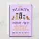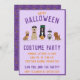 Illustration of three French Bulldog puppies of different colours in pumpkins dressed in Halloween attire.