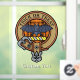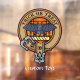 Halloween crest badge with flying bat surrounded by a strap and buckle over tartan background. Custom text.
