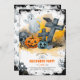 This Halloween party invitation showcases Halloween elements such as crosses, a ghost, Jack o'lantern pumpkins and a raven. There is a black grunge border around it. The back includes a ghost pattern.