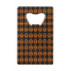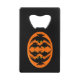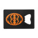 This awesome bottle opener features an orange oval with six crows in it. Each crow has yellow eyes with black pupils and outstretched wings. The crows are flying towards each other forming an oval shape. The background is black.