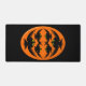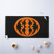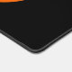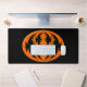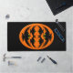 This awesome desk mat features an orange oval with six crows in it. Each crow has yellow eyes with black pupils and outstretched wings. The crows are flying towards each other forming an oval shape. The background is black.