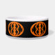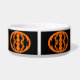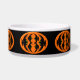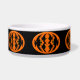 This awesome pet bowl features an orange oval with six crows in it. Each crow has yellow eyes with black pupils and outstretched wings. The crows are flying towards each other forming an oval shape. The background is black.