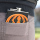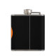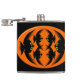 This awesome flask features an orange oval with six crows in it. Each crow has yellow eyes with black pupils and outstretched wings. The crows are flying towards each other forming an oval shape. The background is black.