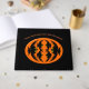 This beautiful guestbook features an orange oval with six crows in it. Each crow has yellow eyes with black pupils and outstretched wings. The crows are flying towards each other forming an oval shape. The background is black.
