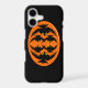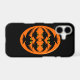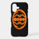 This awesome iPhone case features an orange oval with six crows in it. Each crow has yellow eyes with black pupils and outstretched wings. The crows are flying towards each other forming an oval shape. The background is black.