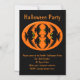 This awesome magnetic party invitation features an orange oval with six crows in it. Each crow has yellow eyes with black pupils and outstretched wings. The crows are flying towards each other forming an oval shape. The background is black.