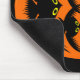 This spooky Halloween mousepad features an orange oval with six crows in it. Each crow has yellow eyes with black pupils and outstretched wings. The crows are flying towards each other forming an oval shape. The background is black.