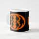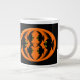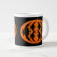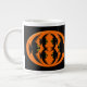 This awesome mug features an orange oval with six crows in it. Each crow has yellow eyes with black pupils and outstretched wings. The crows are flying towards each other forming an oval shape. The background is black.