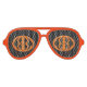 This awesome pair of party shades features an orange oval with six crows in it. Each crow has yellow eyes with black pupils and outstretched wings. The crows are flying towards each other forming an oval shape. The background is black.