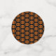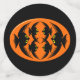 This awesome table confetti features an orange oval with six crows in it. Each crow has yellow eyes with black pupils and outstretched wings. The crows are flying towards each other forming an oval shape. The background is black.