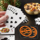 This awesome deck of playing cards features an orange oval with six crows in it. Each crow has yellow eyes with black pupils and outstretched wings. The crows are flying towards each other forming an oval shape. The background is black.