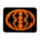 This awesome magnet features an orange oval with six crows in it. Each crow has yellow eyes with black pupils and outstretched wings. The crows are flying towards each other forming an oval shape. The background is black.