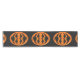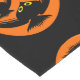 This awesome table runner features an orange oval with six crows in it. Each crow has yellow eyes with black pupils and outstretched wings. The crows are flying towards each other forming an oval shape. The background is black.