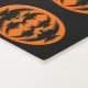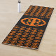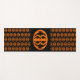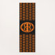 This awesome yoga mat features an orange oval with six crows in it. Each crow has yellow eyes with black pupils and outstretched wings. The crows are flying towards each other forming an oval shape. The background is black.