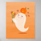 A cute little ghost smiles happily as it floats across a sherbet orange background, holding a bouquet of fall blooms as a beguiling jack-o'-lantern balances atop the ghost's head. Original illustration by Noël Snow