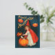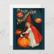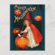 The picture shows a little girl witch dressed in a red cape and pointy hat. She is surrounded by three jack-o'-lantern pumpkins, two of them lit. A fourth pumpkin is also hollowed out, but serve as a kettle. It is filled with small letters, probably Halloween greetings. The dark blue background really makes the girl and the pumpkins, as well as the Halloween message (A Jolly Halloween), stand out.