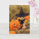 A cute Happy Halloween card with a darling teddy bear dressed with a Halloween witch hat and bow tie and a jack o lantern all set in a pumpkin patch and field.