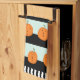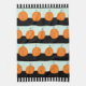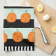 Cute Halloween kitchen decoration featuring orange jack-o-lantern pumpkins on black background.